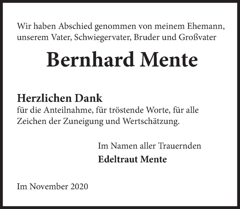 Hier finden Sie alle Traueranzeigen aus der Zeitung, die bisher für Bernhard Mente erschienen sind. Weitere Traueranzeigen, die in der Zeitung erscheinen, werden hier ebenfalls aufgelistet
