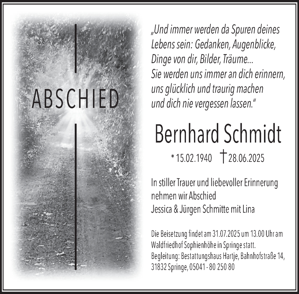 Hier finden Sie alle Traueranzeigen aus der Zeitung, die bisher für Bernhard Schmidt erschienen sind. Weitere Traueranzeigen, die in der Zeitung erscheinen, werden hier ebenfalls aufgelistet
