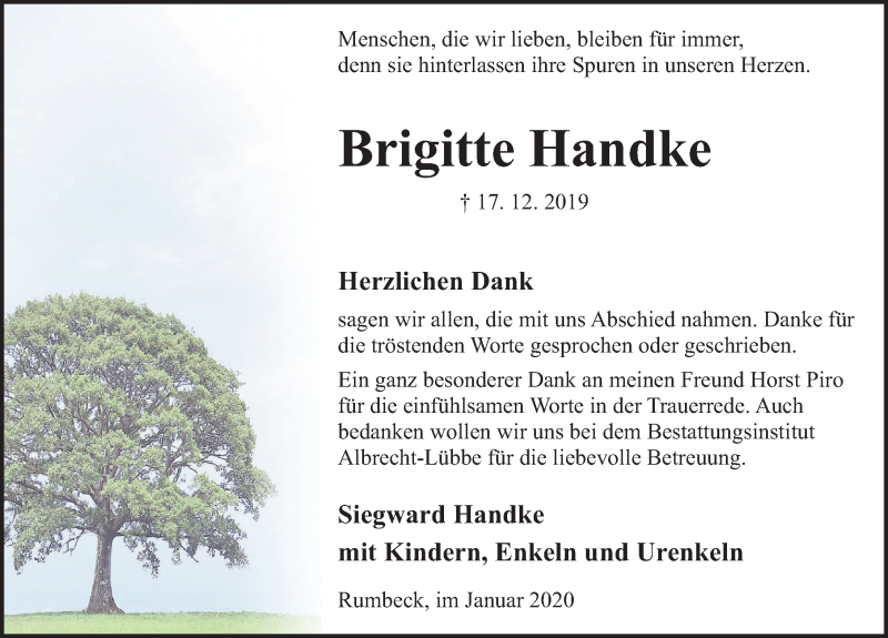 Hier finden Sie alle Traueranzeigen aus der Zeitung, die bisher für Brigitte Handke erschienen sind. Weitere Traueranzeigen, die in der Zeitung erscheinen, werden hier ebenfalls aufgelistet