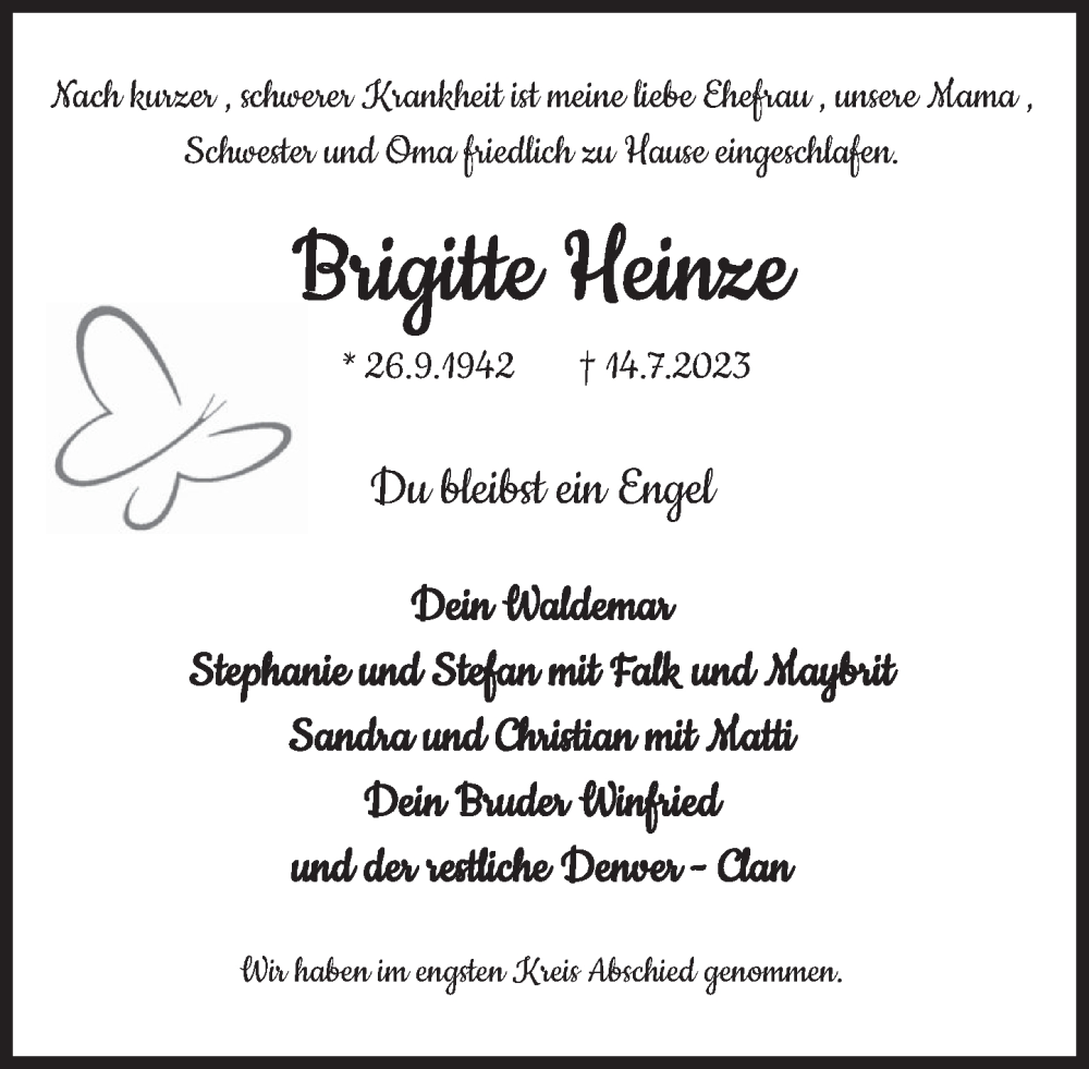 Hier finden Sie alle Traueranzeigen aus der Zeitung, die bisher für Brigitte Heinze erschienen sind. Weitere Traueranzeigen, die in der Zeitung erscheinen, werden hier ebenfalls aufgelistet