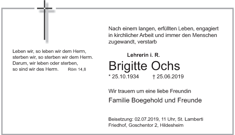 Hier finden Sie alle Traueranzeigen aus der Zeitung, die bisher für Brigitte Ochs erschienen sind. Weitere Traueranzeigen, die in der Zeitung erscheinen, werden hier ebenfalls aufgelistet