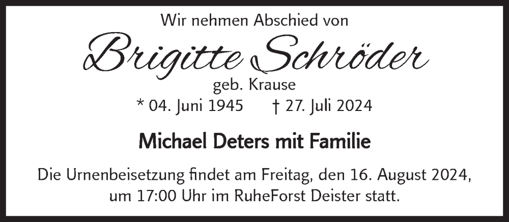 Hier finden Sie alle Traueranzeigen aus der Zeitung, die bisher für Brigitte Schröder erschienen sind. Weitere Traueranzeigen, die in der Zeitung erscheinen, werden hier ebenfalls aufgelistet