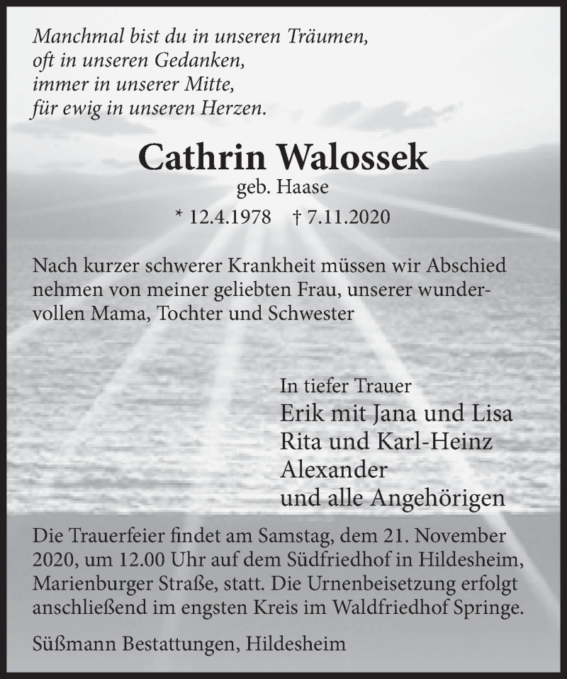 Hier finden Sie alle Traueranzeigen aus der Zeitung, die bisher für Cathrin Walossek erschienen sind. Weitere Traueranzeigen, die in der Zeitung erscheinen, werden hier ebenfalls aufgelistet