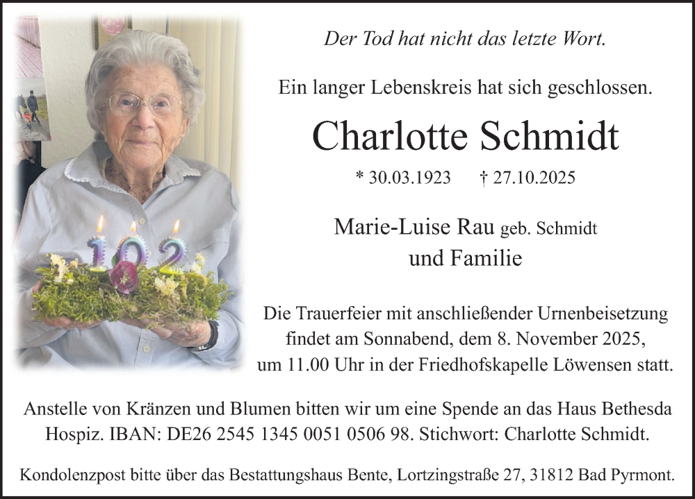 Hier finden Sie alle Traueranzeigen aus der Zeitung, die bisher für Charlotte Schmidt erschienen sind. Weitere Traueranzeigen, die in der Zeitung erscheinen, werden hier ebenfalls aufgelistet