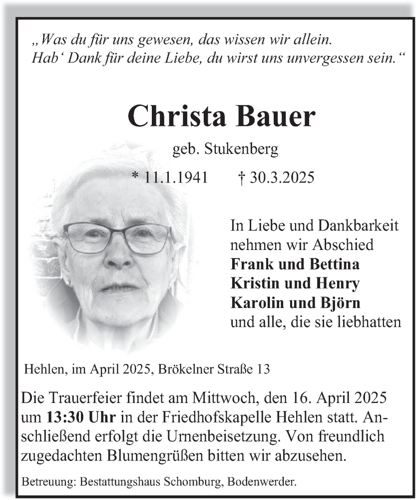 Hier finden Sie alle Traueranzeigen aus der Zeitung, die bisher für Christa Bauer erschienen sind. Weitere Traueranzeigen, die in der Zeitung erscheinen, werden hier ebenfalls aufgelistet