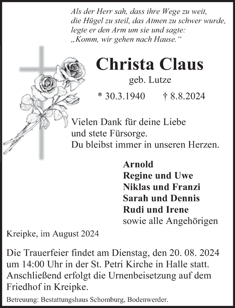 Hier finden Sie alle Traueranzeigen aus der Zeitung, die bisher für Christa Claus erschienen sind. Weitere Traueranzeigen, die in der Zeitung erscheinen, werden hier ebenfalls aufgelistet