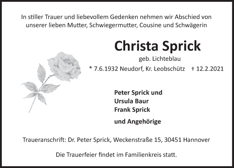 Hier finden Sie alle Traueranzeigen aus der Zeitung, die bisher für Christa Sprick erschienen sind. Weitere Traueranzeigen, die in der Zeitung erscheinen, werden hier ebenfalls aufgelistet