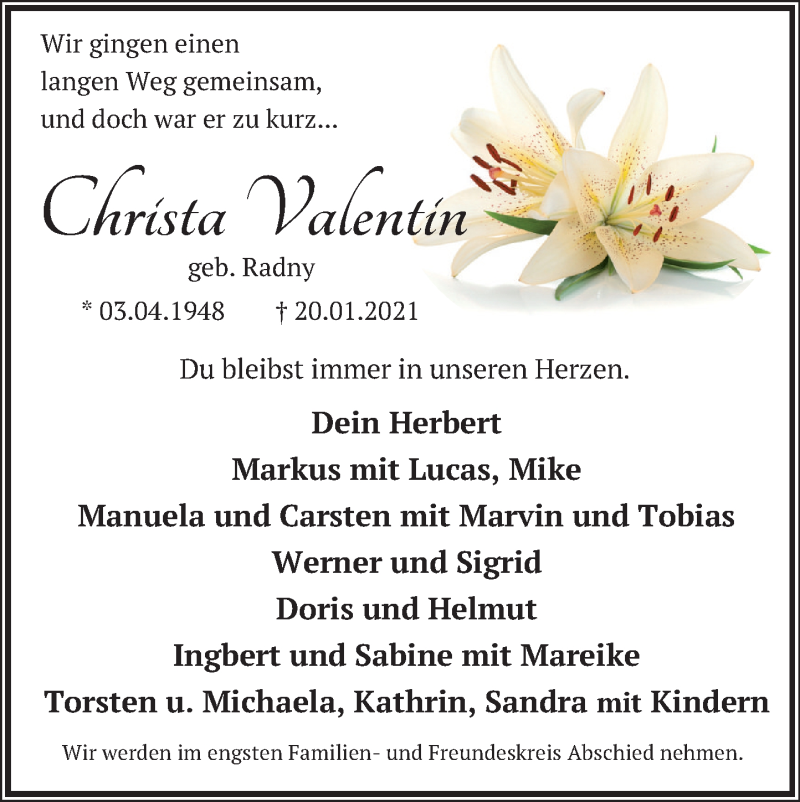 Hier finden Sie alle Traueranzeigen aus der Zeitung, die bisher für Christa Valentin erschienen sind. Weitere Traueranzeigen, die in der Zeitung erscheinen, werden hier ebenfalls aufgelistet