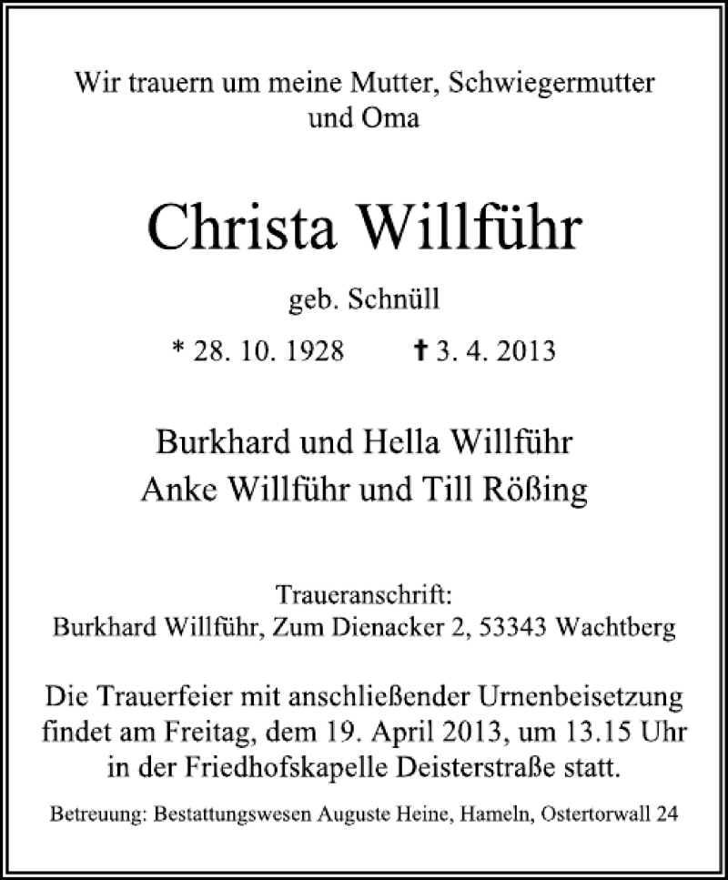 Hier finden Sie alle Traueranzeigen aus der Zeitung, die bisher für Christa Willführ erschienen sind. Weitere Traueranzeigen, die in der Zeitung erscheinen, werden hier ebenfalls aufgelistet