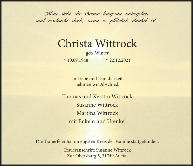 Hier finden Sie alle Traueranzeigen aus der Zeitung, die bisher für Christa Wittrock erschienen sind. Weitere Traueranzeigen, die in der Zeitung erscheinen, werden hier ebenfalls aufgelistet