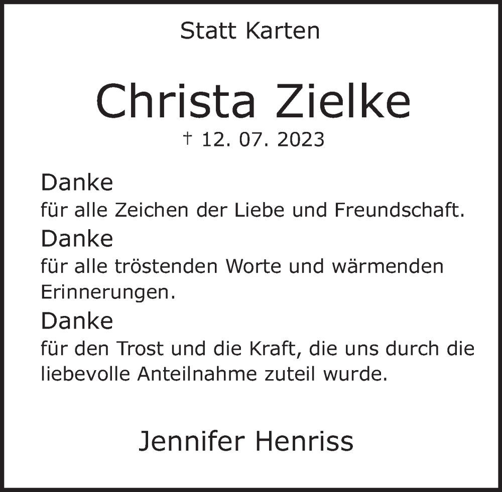 Hier finden Sie alle Traueranzeigen aus der Zeitung, die bisher für Christa Zielke erschienen sind. Weitere Traueranzeigen, die in der Zeitung erscheinen, werden hier ebenfalls aufgelistet