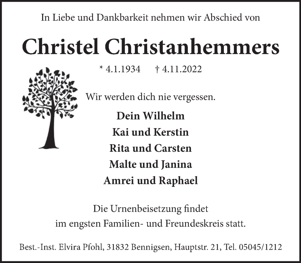 Hier finden Sie alle Traueranzeigen aus der Zeitung, die bisher für Christel Christanhemmers erschienen sind. Weitere Traueranzeigen, die in der Zeitung erscheinen, werden hier ebenfalls aufgelistet