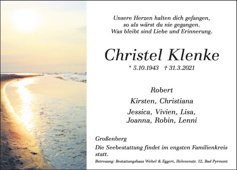 Hier finden Sie alle Traueranzeigen aus der Zeitung, die bisher für Christel Klenke erschienen sind. Weitere Traueranzeigen, die in der Zeitung erscheinen, werden hier ebenfalls aufgelistet
