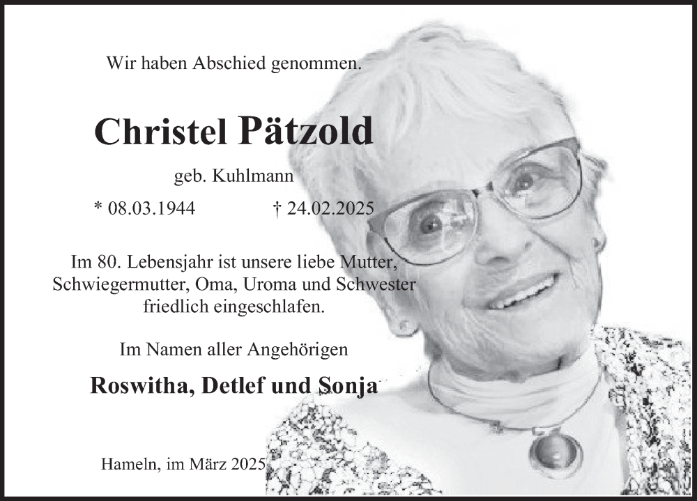 Hier finden Sie alle Traueranzeigen aus der Zeitung, die bisher für Christel Pätzold erschienen sind. Weitere Traueranzeigen, die in der Zeitung erscheinen, werden hier ebenfalls aufgelistet
