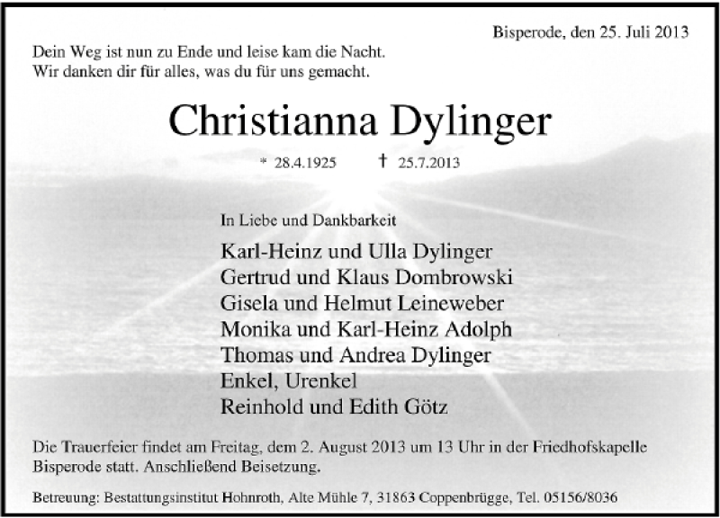 Hier finden Sie alle Traueranzeigen aus der Zeitung, die bisher für Christianna Dylinger erschienen sind. Weitere Traueranzeigen, die in der Zeitung erscheinen, werden hier ebenfalls aufgelistet