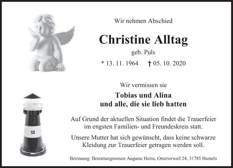 Hier finden Sie alle Traueranzeigen aus der Zeitung, die bisher für Christine Alltag erschienen sind. Weitere Traueranzeigen, die in der Zeitung erscheinen, werden hier ebenfalls aufgelistet