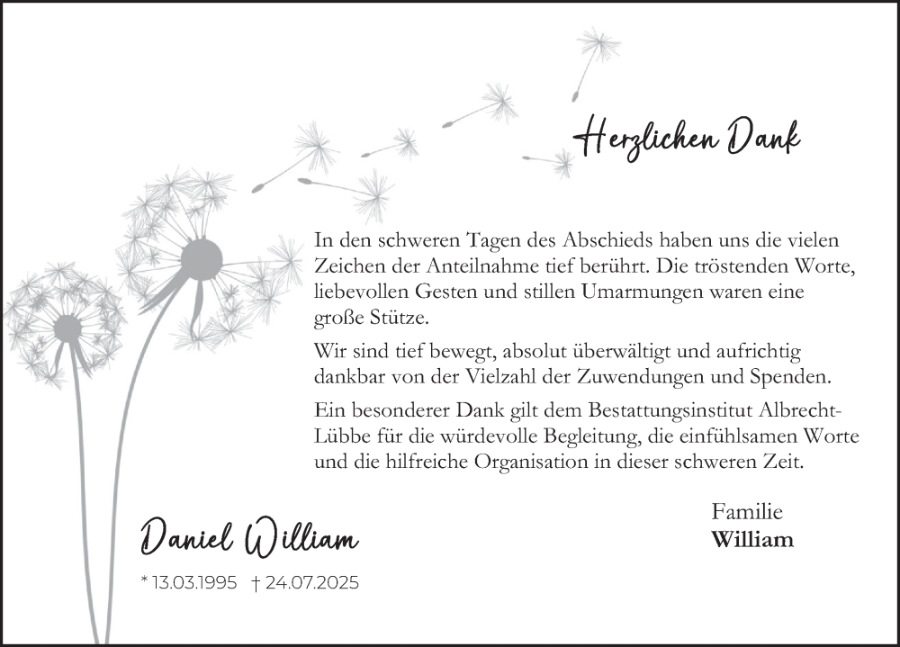 Hier finden Sie alle Traueranzeigen aus der Zeitung, die bisher für Daniel William erschienen sind. Weitere Traueranzeigen, die in der Zeitung erscheinen, werden hier ebenfalls aufgelistet
