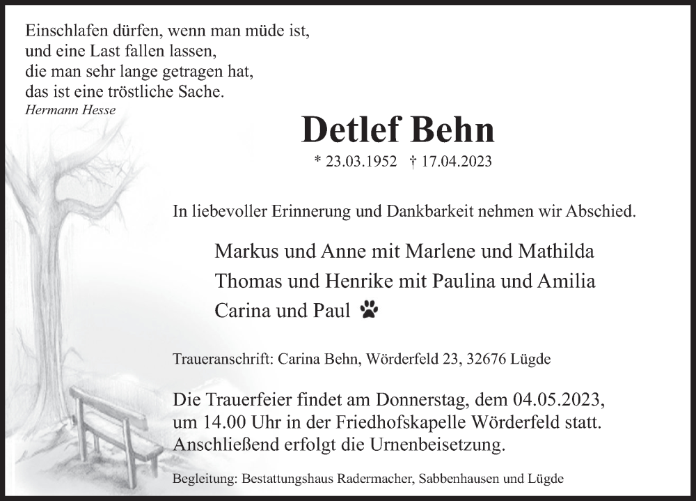 Hier finden Sie alle Traueranzeigen aus der Zeitung, die bisher für Detlef Behn erschienen sind. Weitere Traueranzeigen, die in der Zeitung erscheinen, werden hier ebenfalls aufgelistet
