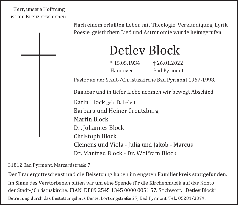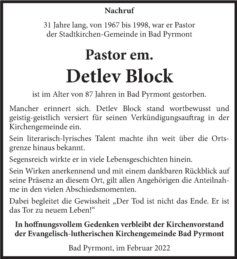 Hier finden Sie alle Traueranzeigen aus der Zeitung, die bisher für Detlev Block erschienen sind. Weitere Traueranzeigen, die in der Zeitung erscheinen, werden hier ebenfalls aufgelistet
