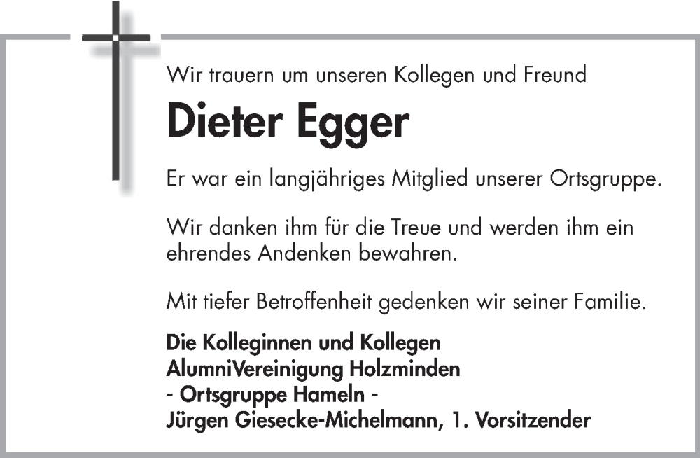 Hier finden Sie alle Traueranzeigen aus der Zeitung, die bisher für Dieter Egger erschienen sind. Weitere Traueranzeigen, die in der Zeitung erscheinen, werden hier ebenfalls aufgelistet