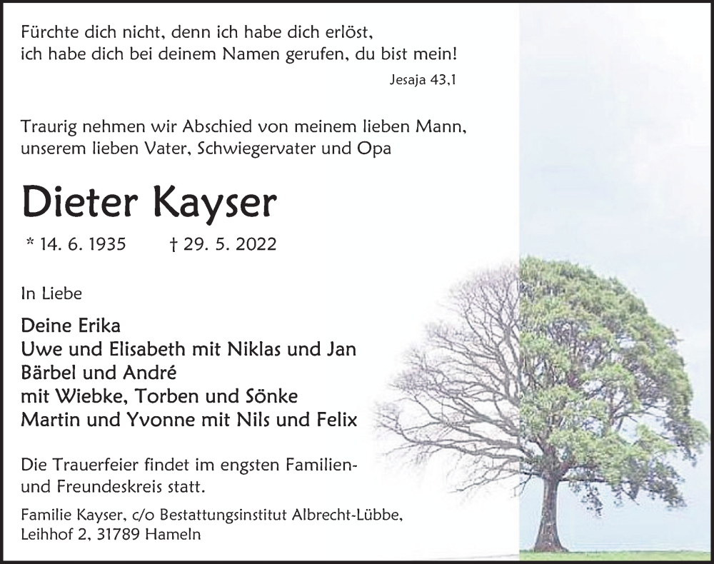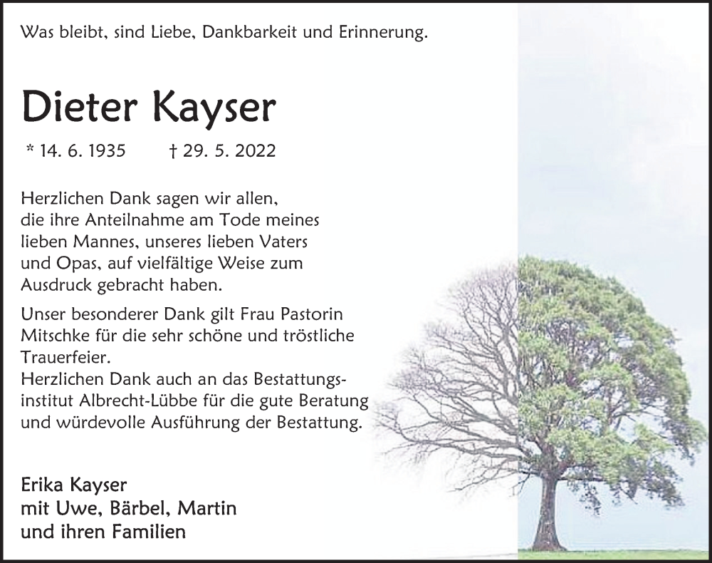 Hier finden Sie alle Traueranzeigen aus der Zeitung, die bisher für Dieter Kayser erschienen sind. Weitere Traueranzeigen, die in der Zeitung erscheinen, werden hier ebenfalls aufgelistet