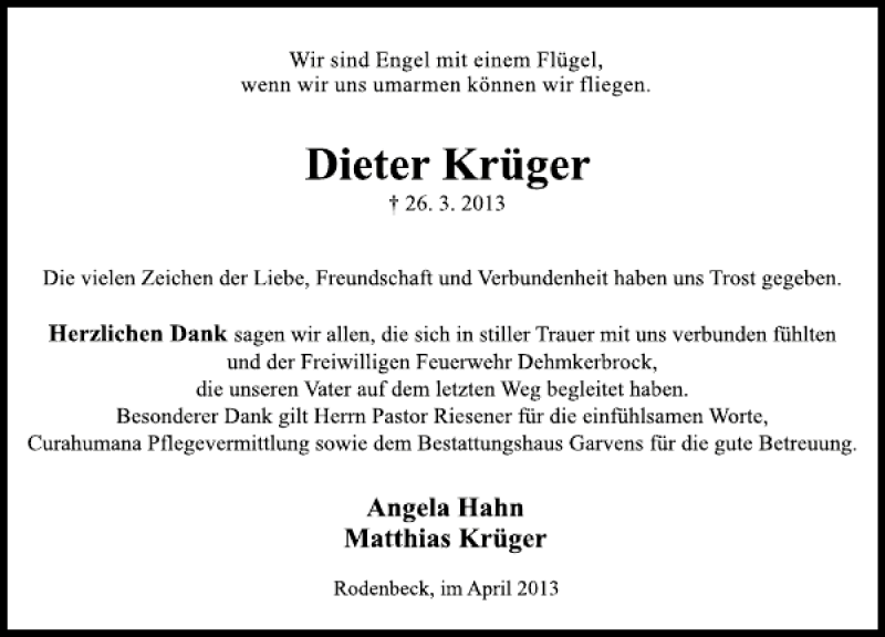 Hier finden Sie alle Traueranzeigen aus der Zeitung, die bisher für Dieter Krüger erschienen sind. Weitere Traueranzeigen, die in der Zeitung erscheinen, werden hier ebenfalls aufgelistet