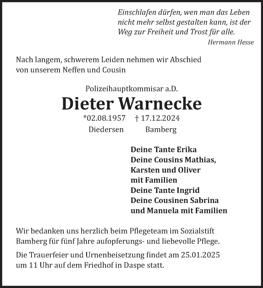 Hier finden Sie alle Traueranzeigen aus der Zeitung, die bisher für Dieter Warnecke erschienen sind. Weitere Traueranzeigen, die in der Zeitung erscheinen, werden hier ebenfalls aufgelistet