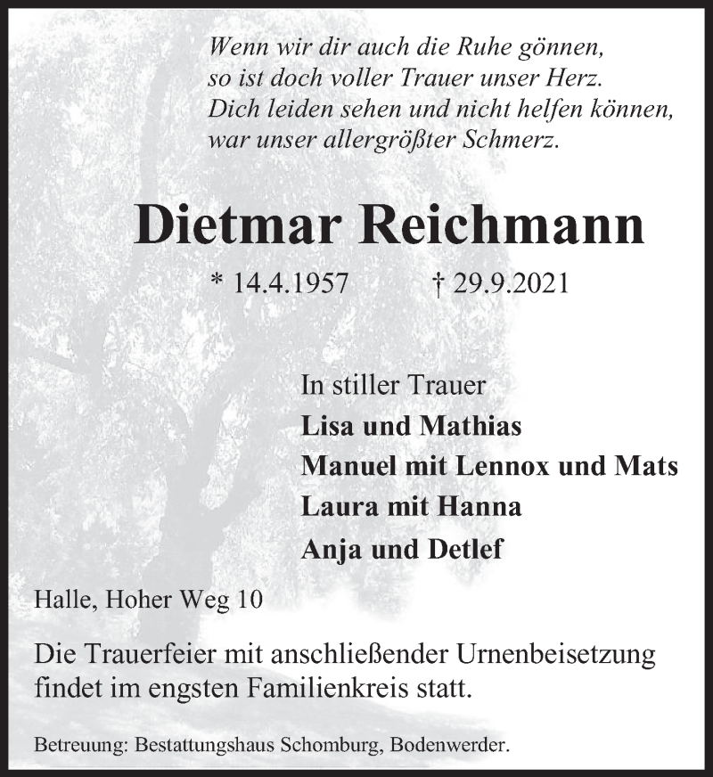 Hier finden Sie alle Traueranzeigen aus der Zeitung, die bisher für Dietmar Reichmann erschienen sind. Weitere Traueranzeigen, die in der Zeitung erscheinen, werden hier ebenfalls aufgelistet