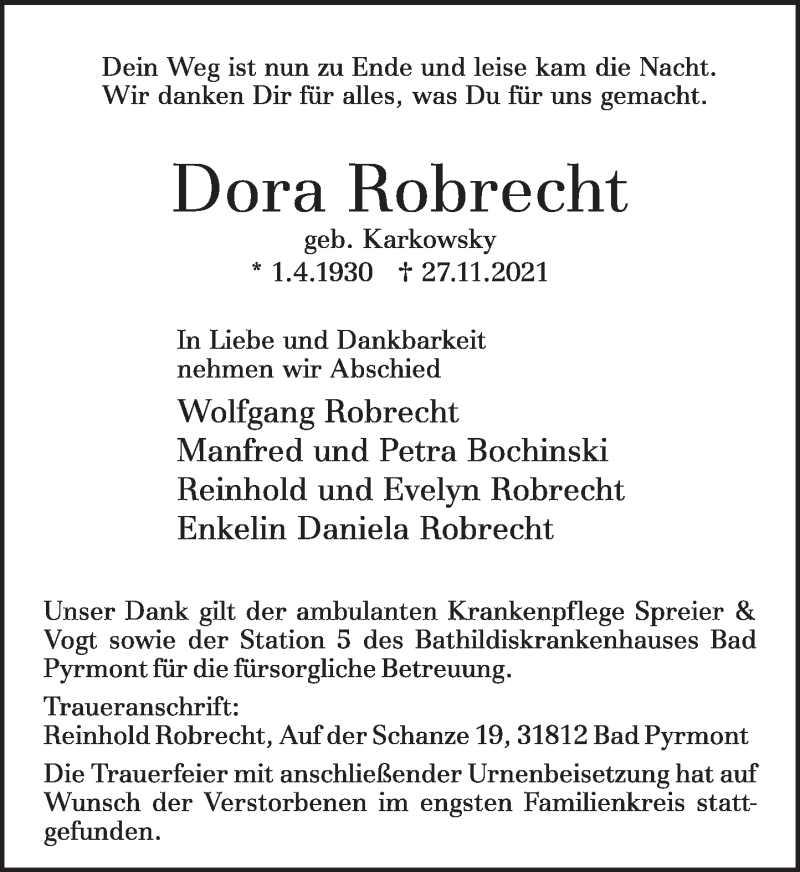 Hier finden Sie alle Traueranzeigen aus der Zeitung, die bisher für Dora Robrecht erschienen sind. Weitere Traueranzeigen, die in der Zeitung erscheinen, werden hier ebenfalls aufgelistet
