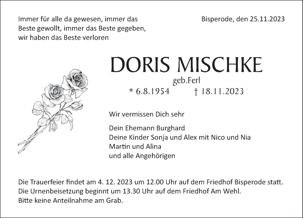 Hier finden Sie alle Traueranzeigen aus der Zeitung, die bisher für Doris Mischke erschienen sind. Weitere Traueranzeigen, die in der Zeitung erscheinen, werden hier ebenfalls aufgelistet