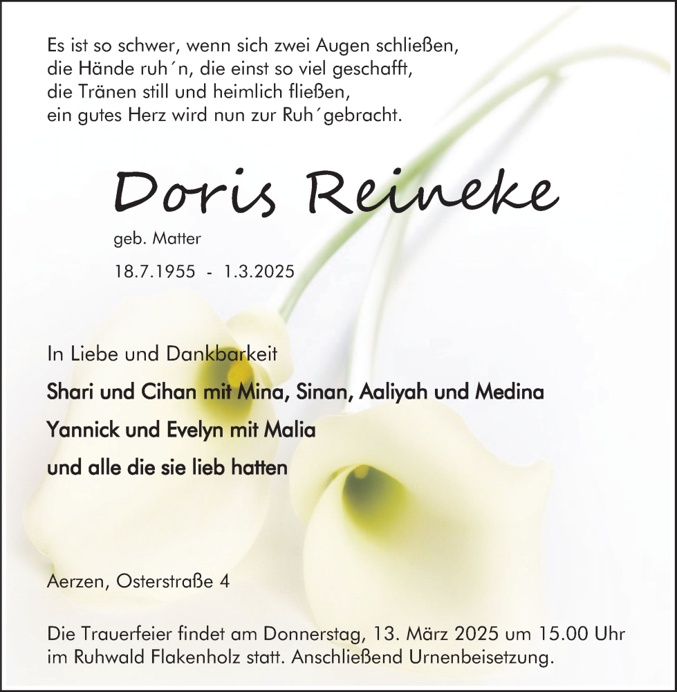 Hier finden Sie alle Traueranzeigen aus der Zeitung, die bisher für Doris Reineke erschienen sind. Weitere Traueranzeigen, die in der Zeitung erscheinen, werden hier ebenfalls aufgelistet