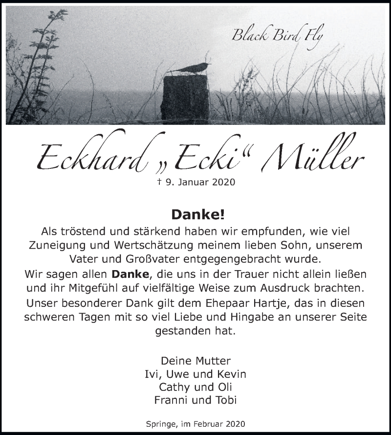 Hier finden Sie alle Traueranzeigen aus der Zeitung, die bisher für Eckhard Müller erschienen sind. Weitere Traueranzeigen, die in der Zeitung erscheinen, werden hier ebenfalls aufgelistet