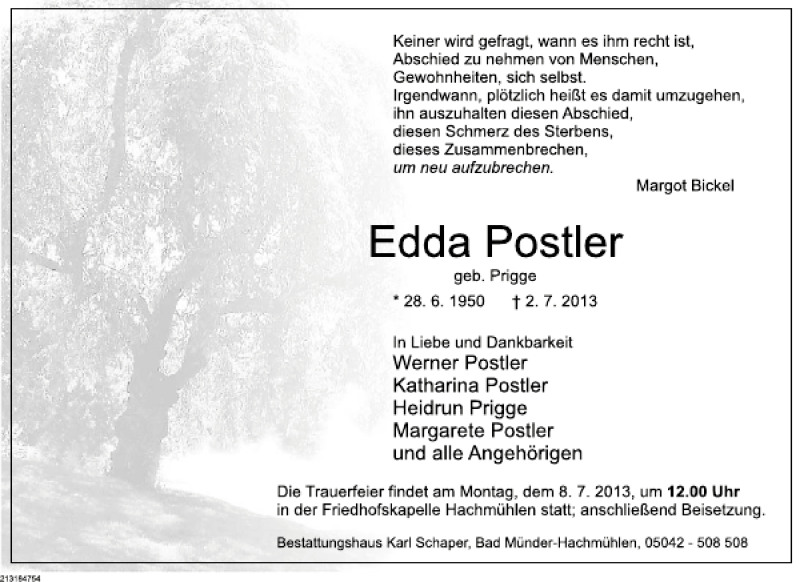 Hier finden Sie alle Traueranzeigen aus der Zeitung, die bisher für Edda Postler erschienen sind. Weitere Traueranzeigen, die in der Zeitung erscheinen, werden hier ebenfalls aufgelistet