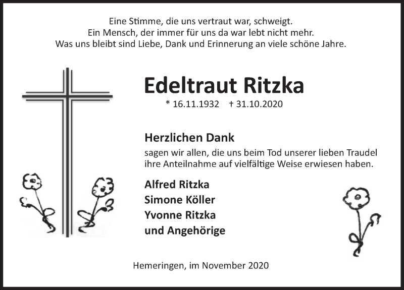 Hier finden Sie alle Traueranzeigen aus der Zeitung, die bisher für Edeltraut Ritzka erschienen sind. Weitere Traueranzeigen, die in der Zeitung erscheinen, werden hier ebenfalls aufgelistet