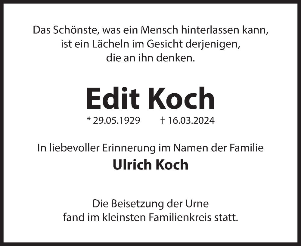 Hier finden Sie alle Traueranzeigen aus der Zeitung, die bisher für Edit Koch erschienen sind. Weitere Traueranzeigen, die in der Zeitung erscheinen, werden hier ebenfalls aufgelistet