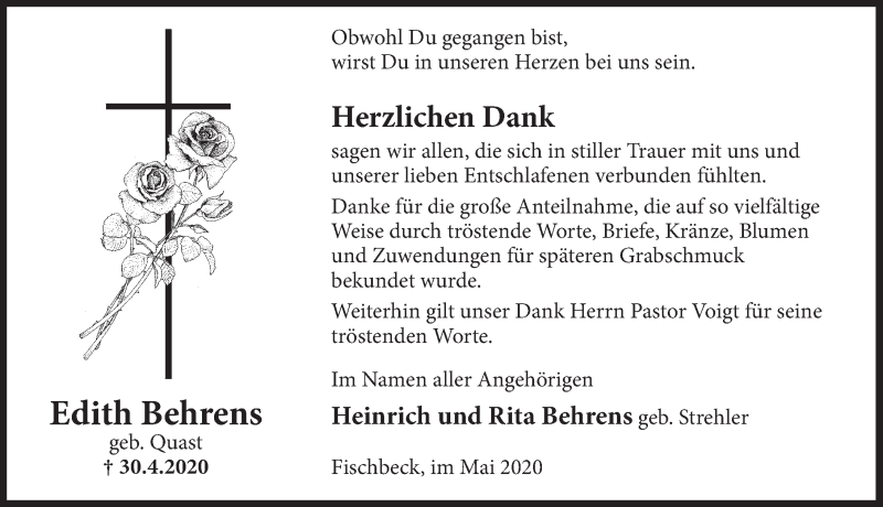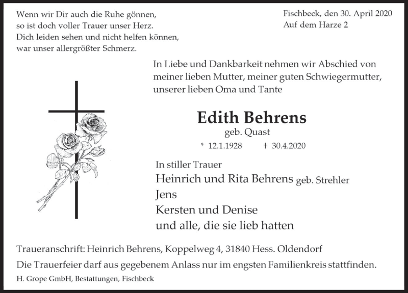 Hier finden Sie alle Traueranzeigen aus der Zeitung, die bisher für Edith Behrens erschienen sind. Weitere Traueranzeigen, die in der Zeitung erscheinen, werden hier ebenfalls aufgelistet