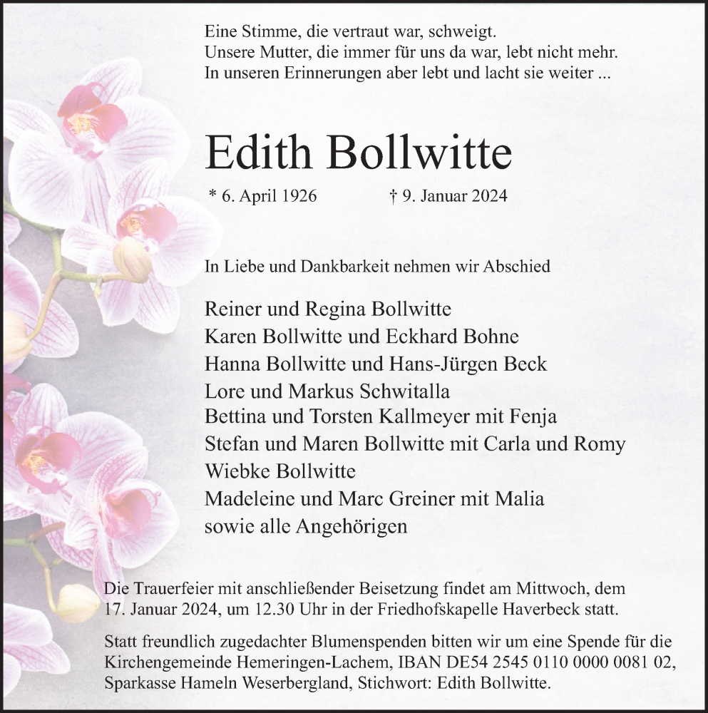 Hier finden Sie alle Traueranzeigen aus der Zeitung, die bisher für Edith Bollwitte erschienen sind. Weitere Traueranzeigen, die in der Zeitung erscheinen, werden hier ebenfalls aufgelistet