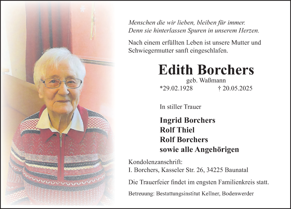 Hier finden Sie alle Traueranzeigen aus der Zeitung, die bisher für Edith Borchers erschienen sind. Weitere Traueranzeigen, die in der Zeitung erscheinen, werden hier ebenfalls aufgelistet