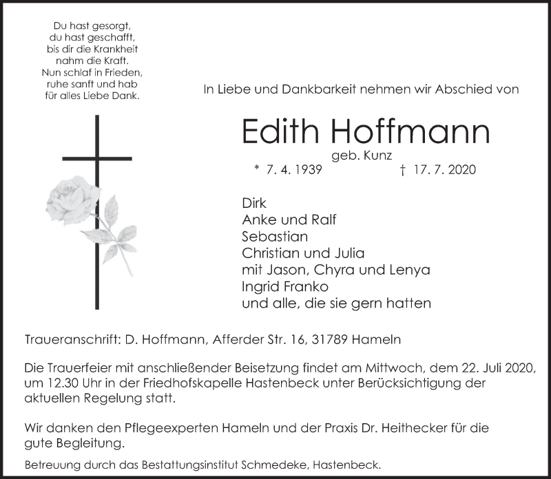 Hier finden Sie alle Traueranzeigen aus der Zeitung, die bisher für Edith Hoffmann erschienen sind. Weitere Traueranzeigen, die in der Zeitung erscheinen, werden hier ebenfalls aufgelistet
