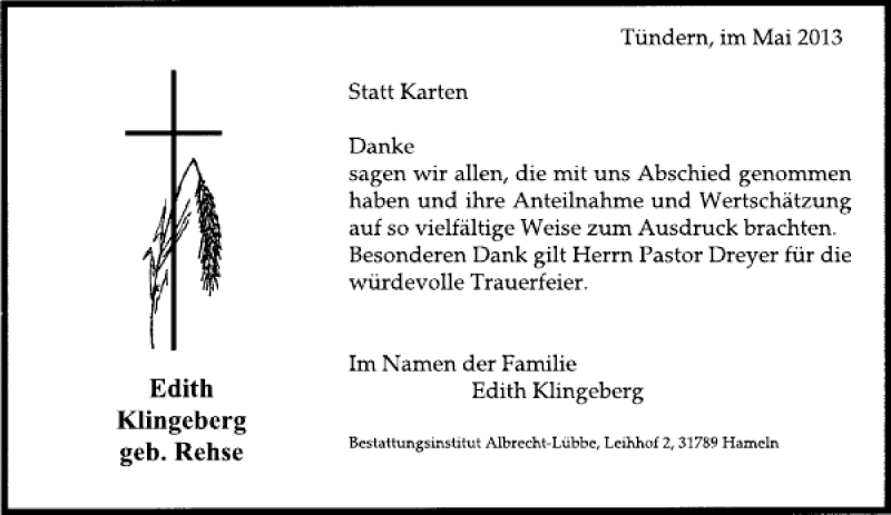 Hier finden Sie alle Traueranzeigen aus der Zeitung, die bisher für Edith Klingeberg erschienen sind. Weitere Traueranzeigen, die in der Zeitung erscheinen, werden hier ebenfalls aufgelistet
