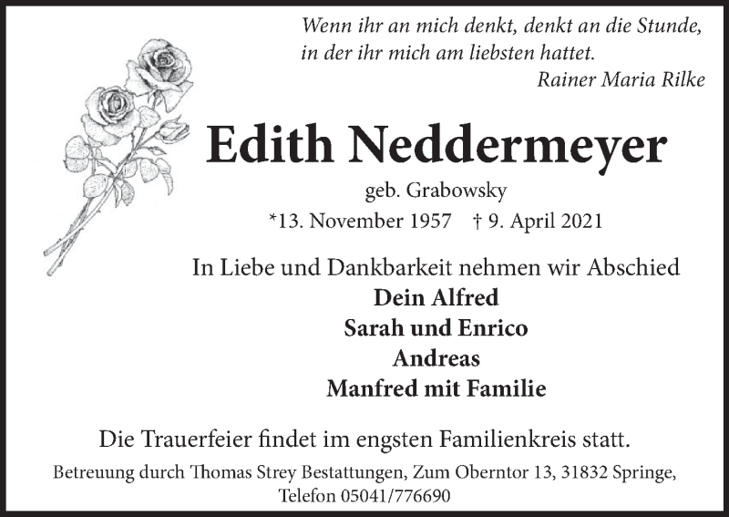 Hier finden Sie alle Traueranzeigen aus der Zeitung, die bisher für Edith Neddermeyer erschienen sind. Weitere Traueranzeigen, die in der Zeitung erscheinen, werden hier ebenfalls aufgelistet