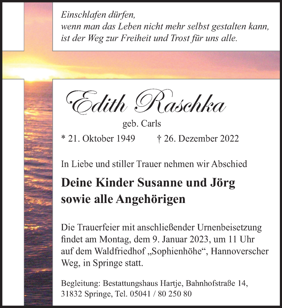 Hier finden Sie alle Traueranzeigen aus der Zeitung, die bisher für Edith Raschka erschienen sind. Weitere Traueranzeigen, die in der Zeitung erscheinen, werden hier ebenfalls aufgelistet