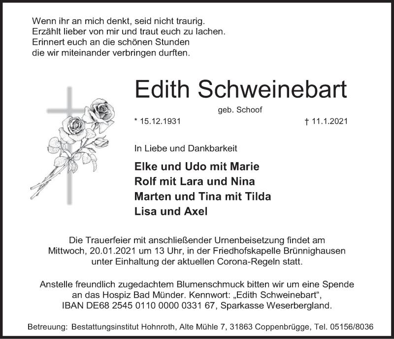Hier finden Sie alle Traueranzeigen aus der Zeitung, die bisher für Edith Schweinebart erschienen sind. Weitere Traueranzeigen, die in der Zeitung erscheinen, werden hier ebenfalls aufgelistet