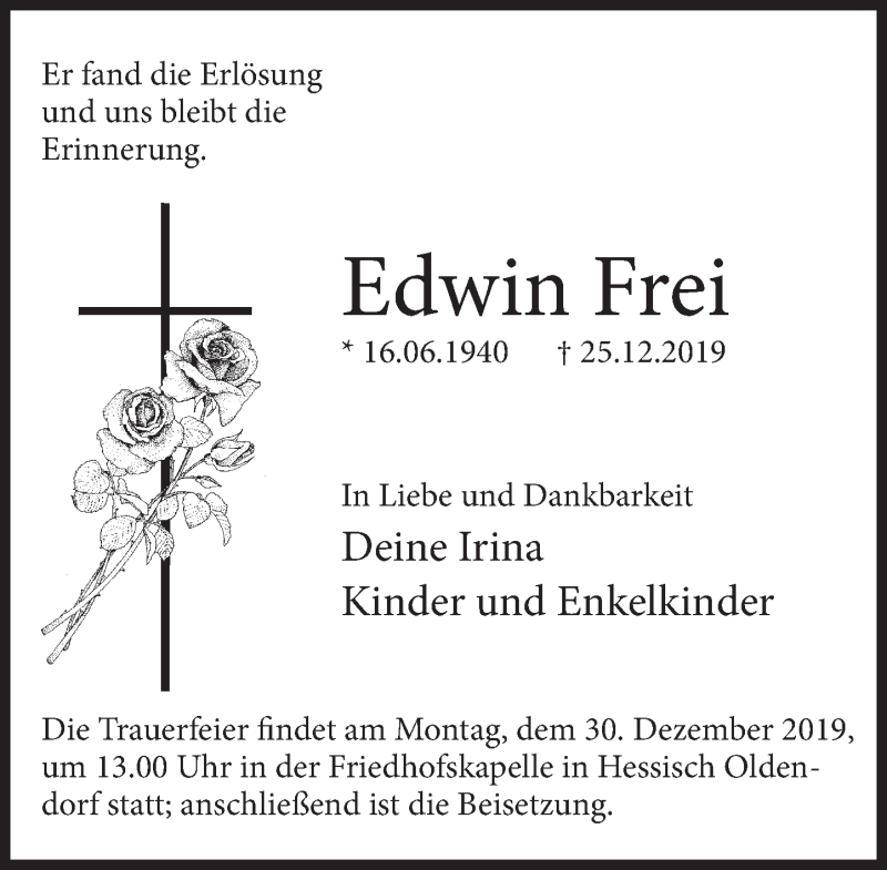 Hier finden Sie alle Traueranzeigen aus der Zeitung, die bisher für Edwin Frei erschienen sind. Weitere Traueranzeigen, die in der Zeitung erscheinen, werden hier ebenfalls aufgelistet