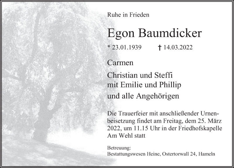 Hier finden Sie alle Traueranzeigen aus der Zeitung, die bisher für Egon Baumdicker erschienen sind. Weitere Traueranzeigen, die in der Zeitung erscheinen, werden hier ebenfalls aufgelistet