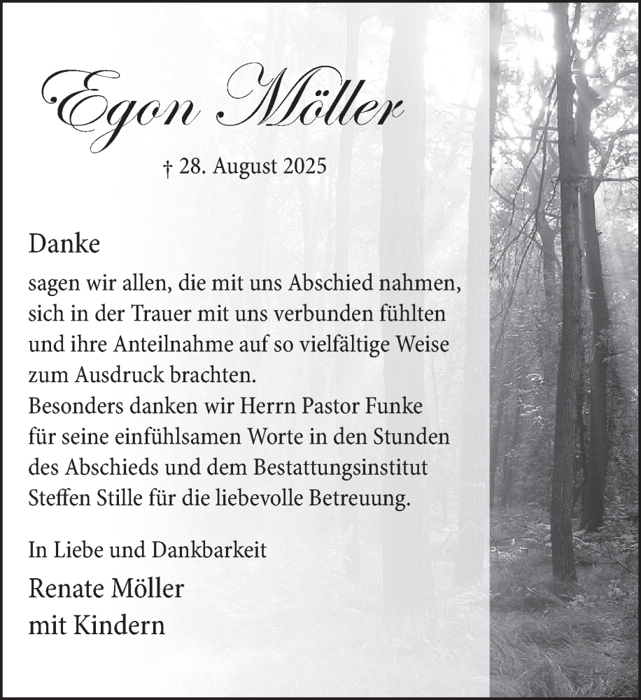 Hier finden Sie alle Traueranzeigen aus der Zeitung, die bisher für Egon Möller erschienen sind. Weitere Traueranzeigen, die in der Zeitung erscheinen, werden hier ebenfalls aufgelistet