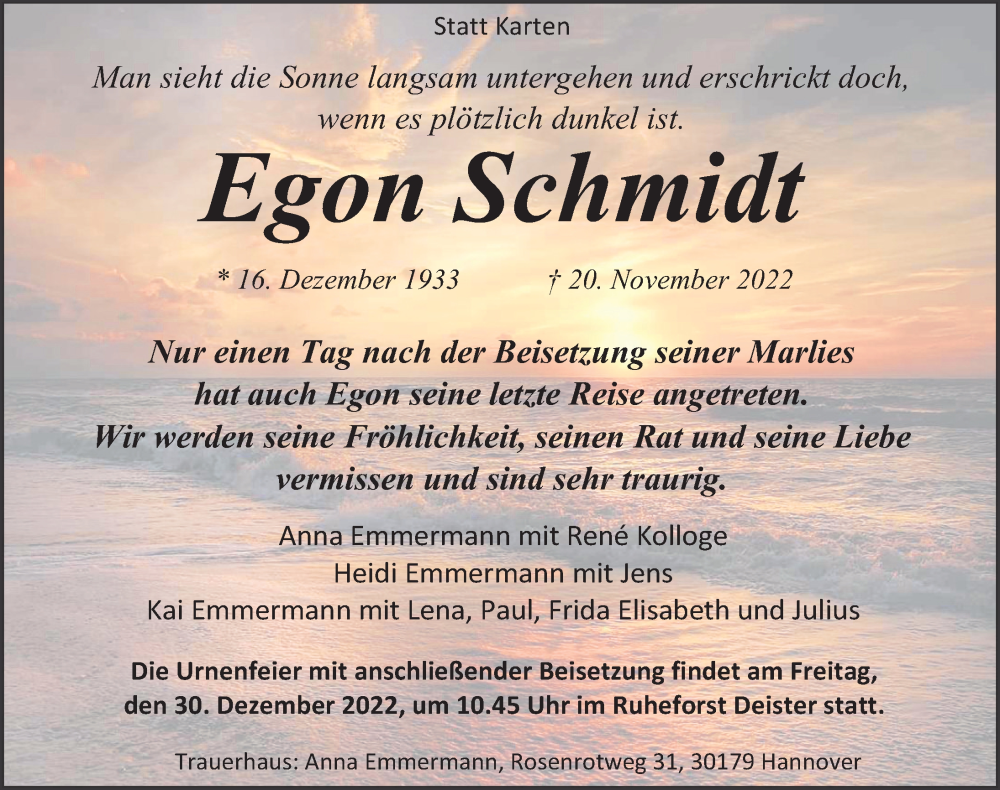 Hier finden Sie alle Traueranzeigen aus der Zeitung, die bisher für Egon Schmidt erschienen sind. Weitere Traueranzeigen, die in der Zeitung erscheinen, werden hier ebenfalls aufgelistet