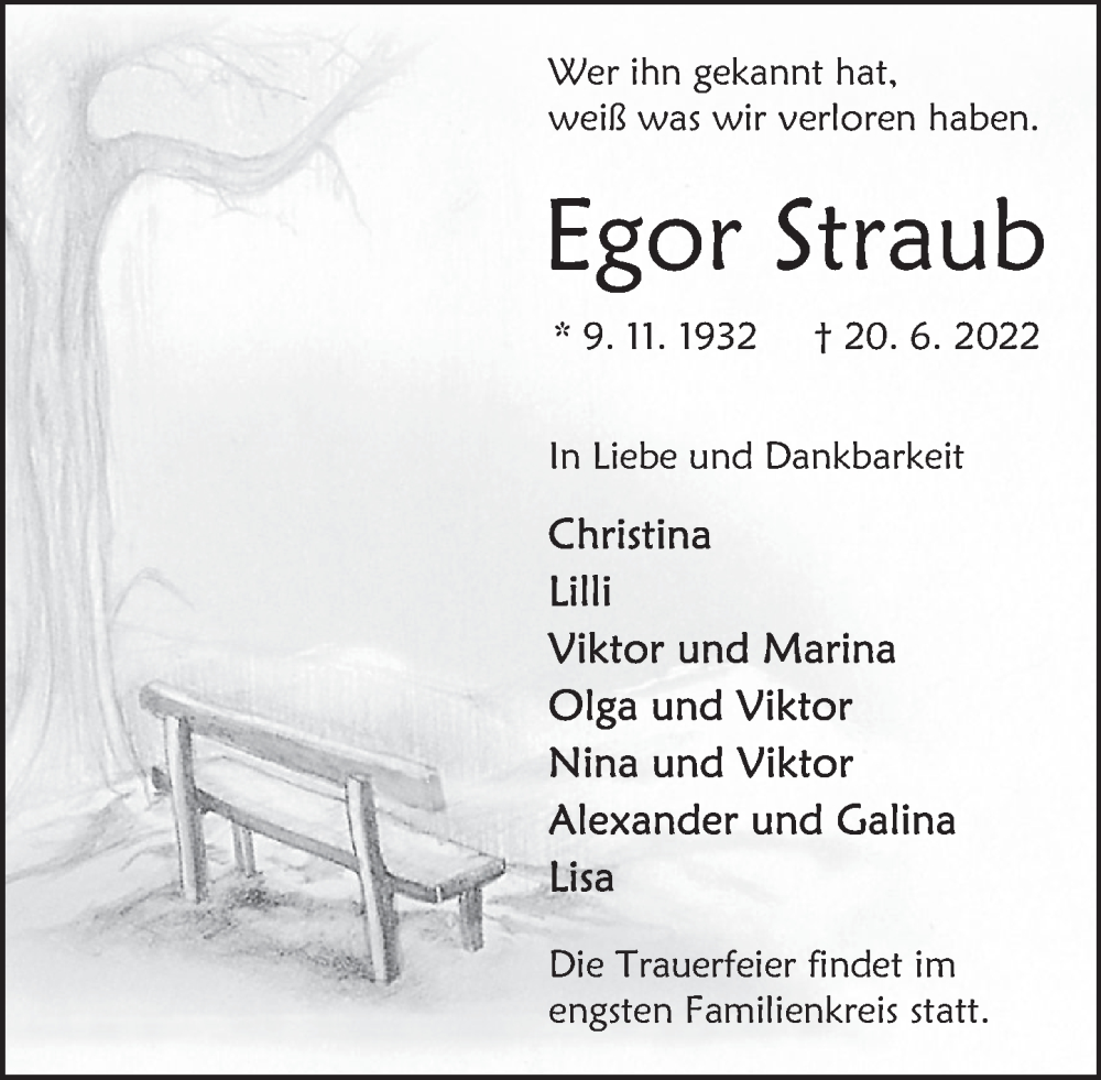 Hier finden Sie alle Traueranzeigen aus der Zeitung, die bisher für Egor Straub erschienen sind. Weitere Traueranzeigen, die in der Zeitung erscheinen, werden hier ebenfalls aufgelistet