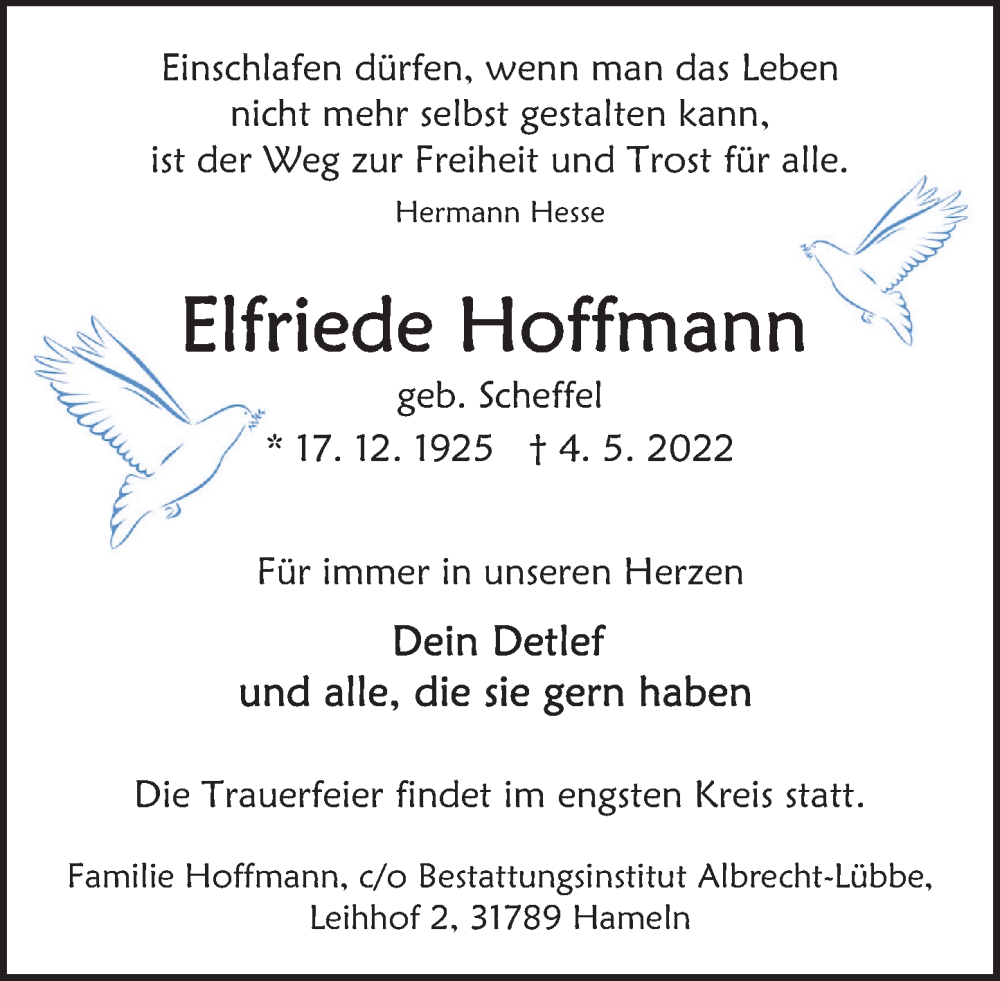 Hier finden Sie alle Traueranzeigen aus der Zeitung, die bisher für Elfriede Hoffmann erschienen sind. Weitere Traueranzeigen, die in der Zeitung erscheinen, werden hier ebenfalls aufgelistet