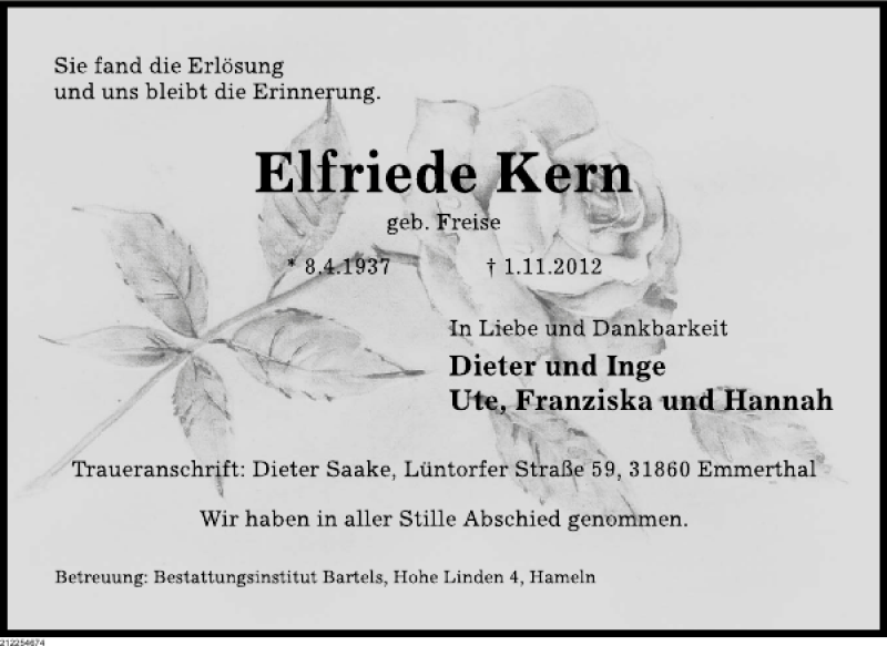 Hier finden Sie alle Traueranzeigen aus der Zeitung, die bisher für Elfriede Kern erschienen sind. Weitere Traueranzeigen, die in der Zeitung erscheinen, werden hier ebenfalls aufgelistet